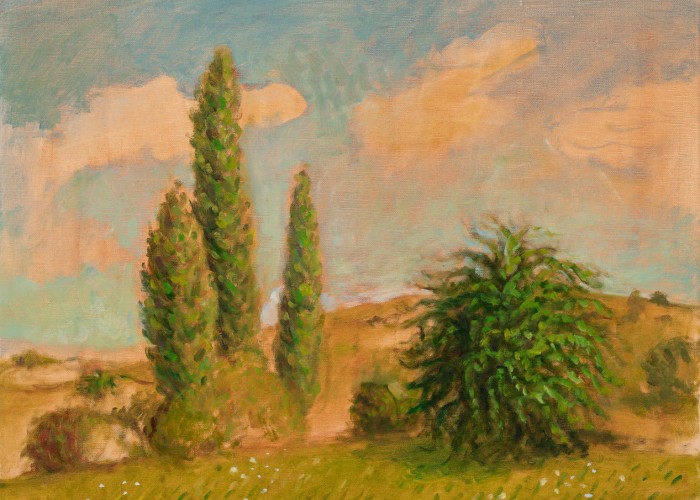 Gabrielle Martin paints the landscape near her home in the Goldfields town of Malmsbury. This land was reshaped in the 19th Century by civic rail and water projects, and grazing that serviced the goldmining industry. There are parallels between this landscape and the orchards and paddocks on the outer fringes of Melbourne when she was growing up in the 1970s. Wild fruit trees, weathered pines and dry fields of grass are common to both, as well as endemic gorse, blackberries and briar rose that resist the best efforts at control. Watching children playing in the long grass unlocks memories of her own childhood play.